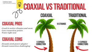 Standard or a “Traditional” plug is the good old fashioned Edison plug that can plug directly into the receptacle. While being the most popular route for installers, they do have there downside. Water and electricity do not mix and the amount of exposure they have to these outside elements is much higher than the Coaxial strands.