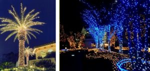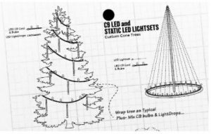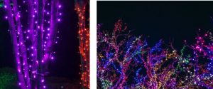 4″ spacing on mini lights is slowing becoming the more popular choice. While a tad more expensive, when decorating trees and bushes, there is a noticeable difference in the amount of lights on the subject when using 4″ spacing. Here is an example when working with different bulb spacing;